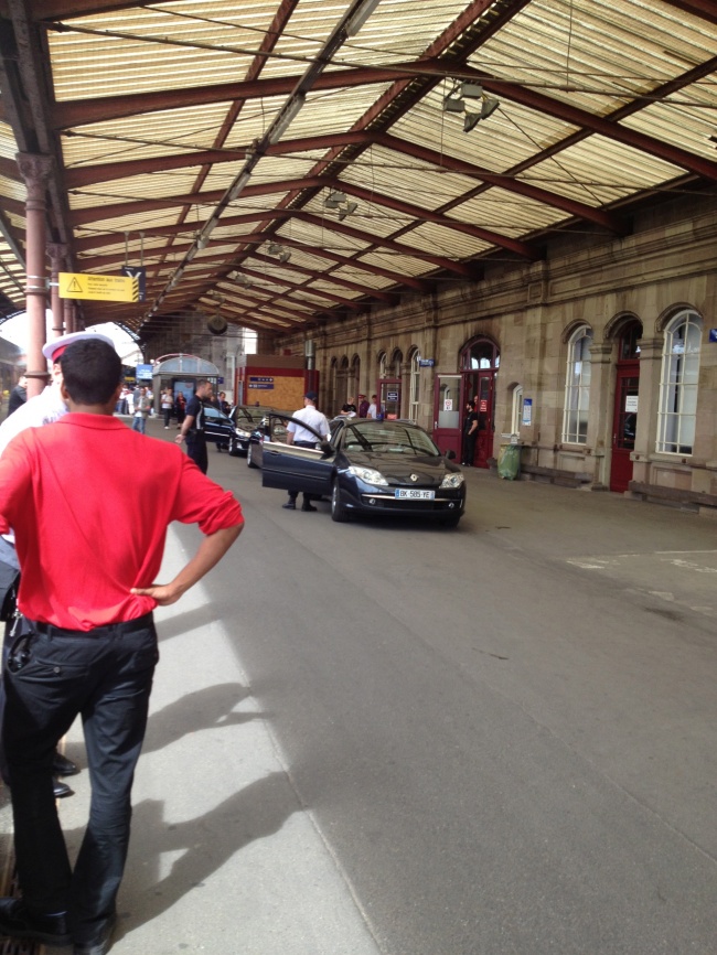 Samedi 15 juin. Dans le TGV Paris-Strasbourg, Christiane Taubira, Ministre de la Justice, et toujours à la « une » avec une loi, votée, (sur le mariage gay) mais qui continue à déchainer les passions et à provoquer ici où là, à chaque déplacement du Garde des Sceaux, manifestations ou happening, de celles et ceux pour lesquels la pilule ne passent pas. De dos, Madame Le Ministre, à l’arrivée d’un voyage, voulu discret, (reconnaissable à sa veste fétiche de couleur rose). L’homme qui à ‘oeil noir (de face) est un de ses gardes du corps du SPHP, (Service Protection Hautes Personnalités). On remarquera, le regard, scotché à la vitre d’une voyageuse. A bien y regarder, on ne s’en étonnera pas. Un quai de Gare sur lequel on a fait venir un convoi de limousines ministérielles, ça n’arrive pas tous les jours ! Photos@fh